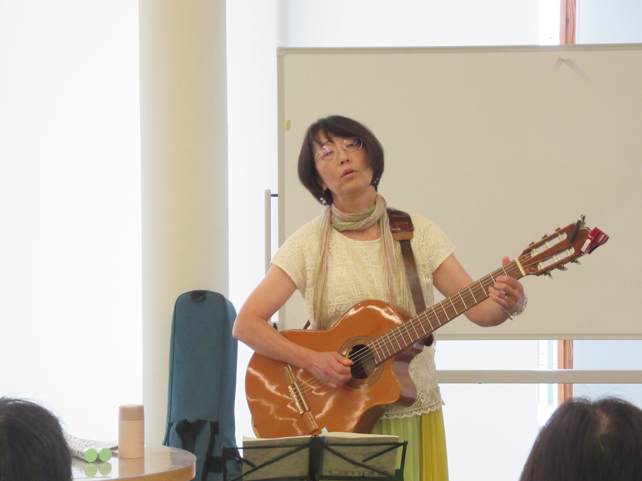 大雨が降り、観客数を心配しましたが、演奏者若木さんのお知り合いの方、館内でお声をかけた方、ひだまりサロンに毎回来て下さる方、ギターの音色に導かれていらした方など、多くの方が集まりました。若木さんのギター音楽の歴史についてのお話にも、皆さん熱心に耳を傾けて、ギターの演奏に聞き入っていました。