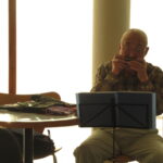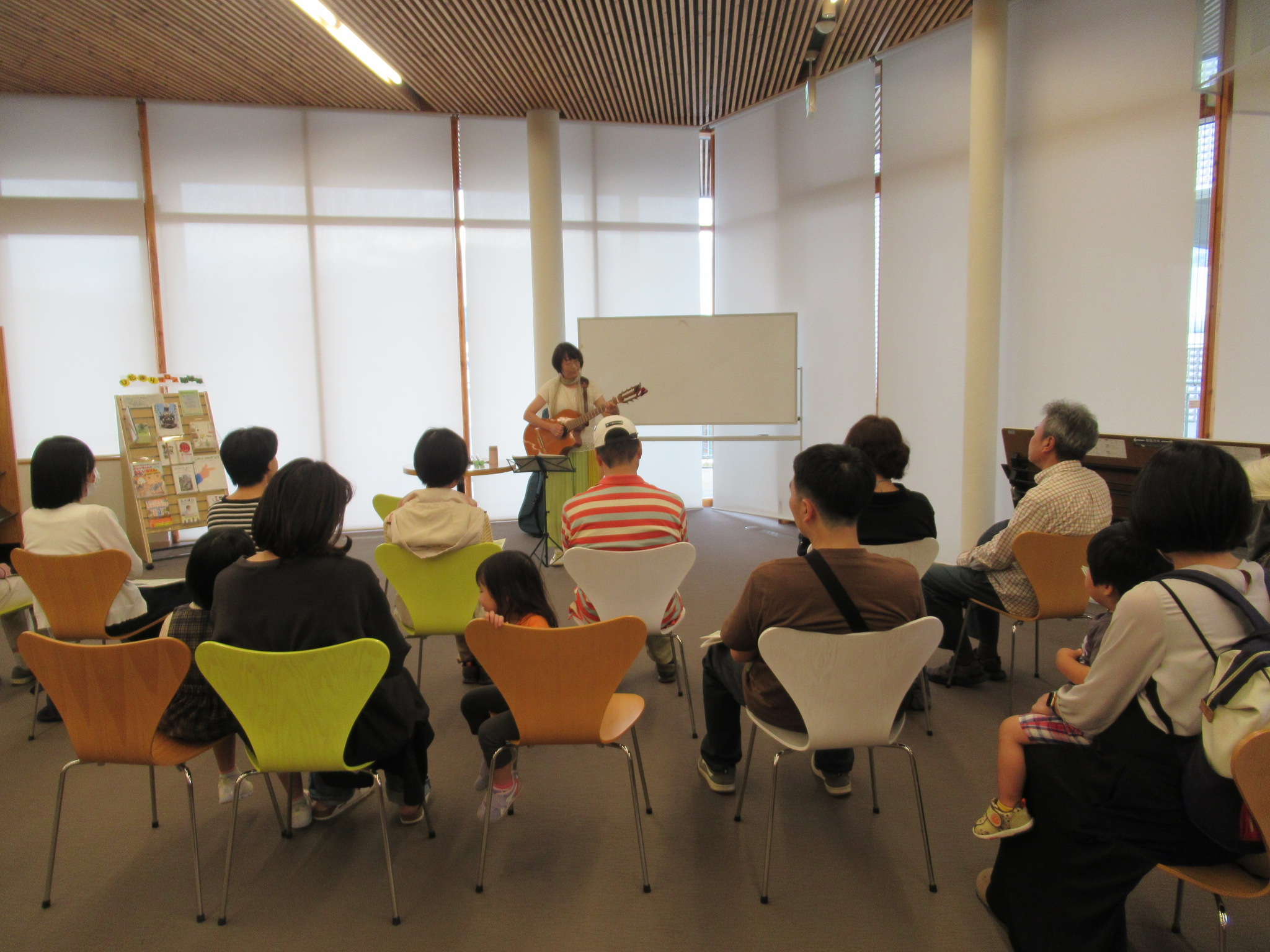 吉岡さんの演奏を聞きに来られた方、館内に流れる曲に引き寄せられていらした方、また、机に向かいながら耳を傾けている方など、いらっしゃいました。テーマ「誕生~Welcom~」に合った曲を演奏いただき、聞いている方の中には涙ぐんでいる方もいらっしゃいました。オリジナル曲「ご先祖様のうた」では、皆さん手拍子を打ちながら楽しんでいました。