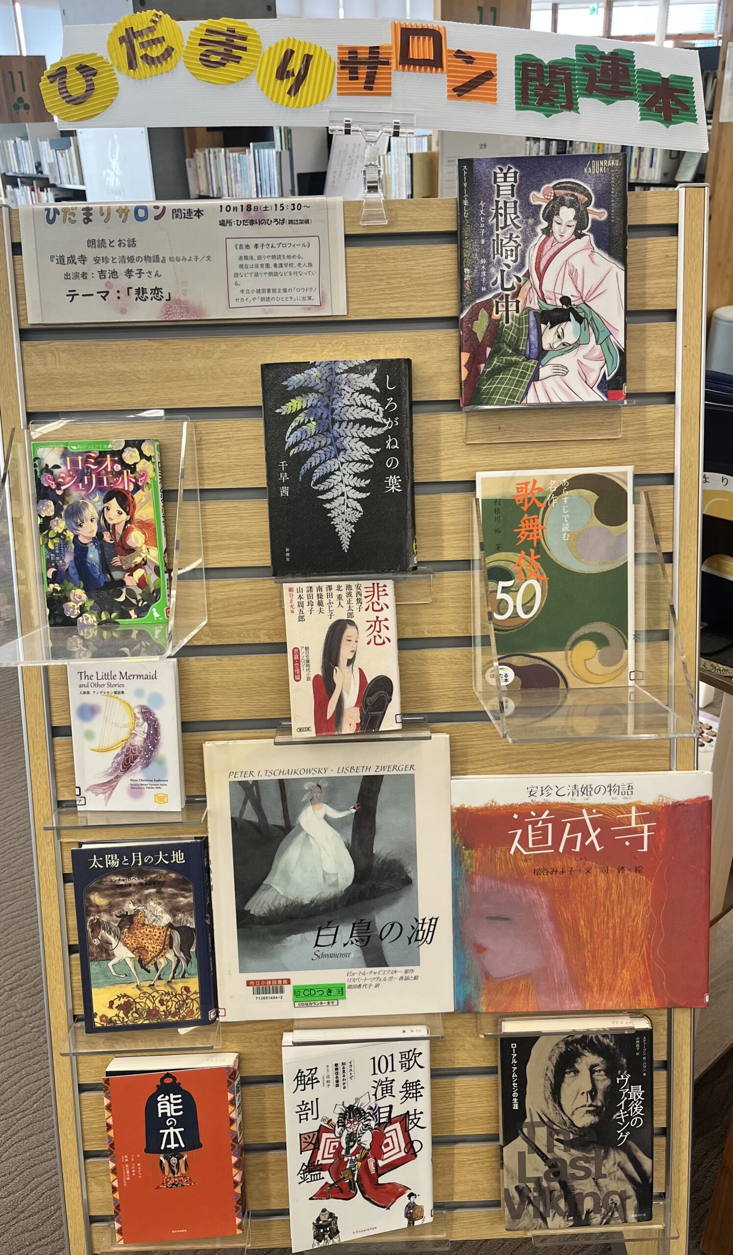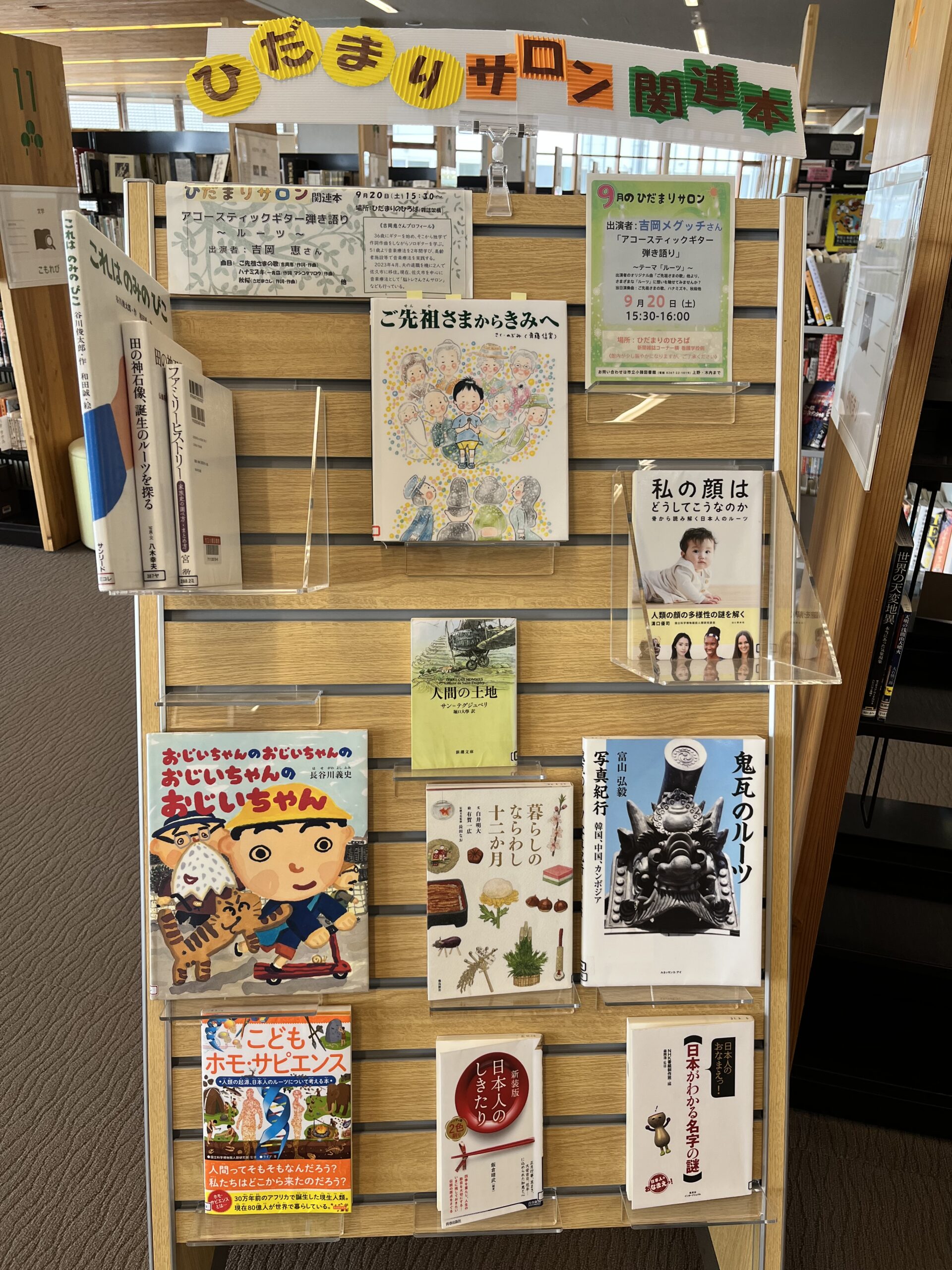 図書館職員による紹介本、「雑草の暮らし」甲斐信枝/著 厄介に思われている雑草も毎日観察すると愛着がわきます。「パンダの祖先はお肉が好き!?」土屋健/著 動物園の動物から祖先を学べます。「せいめいのれきし」バージニア・リー・バートン/著 地球の誕生か今に至るまでを振り返ることが出来ます。長く読み継がれている本です。「いのちのまつり」草場一義壽/著 吉岡さんのオリジナル曲にマッチしたご先祖様がたくさんいて、今の自分がいるというお話 これらの本を通して、命の誕生の大切さ、暖かさを伝えられたらと思います。