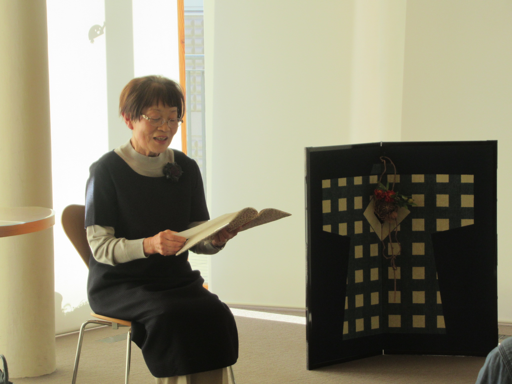 今回は、ひだまりサロンに初出演のおはなしチチンプイさんの語り(お話)でした。いつもは子どもたちに向けてお話しをしていらっしゃいますが、大人の方にも耳で聞いて楽しむお話の世界を届けたいとの思いで出演していただきました。語り(お話)は本を見ずに覚えたお話をみなさんに直接語りかけます。目を合わせおはなしを聞くため、より没入感があり、お話の情景がありありと浮かんできました。三者三様のお話に、参加いただいたみなさんも引き込まれているようでした。