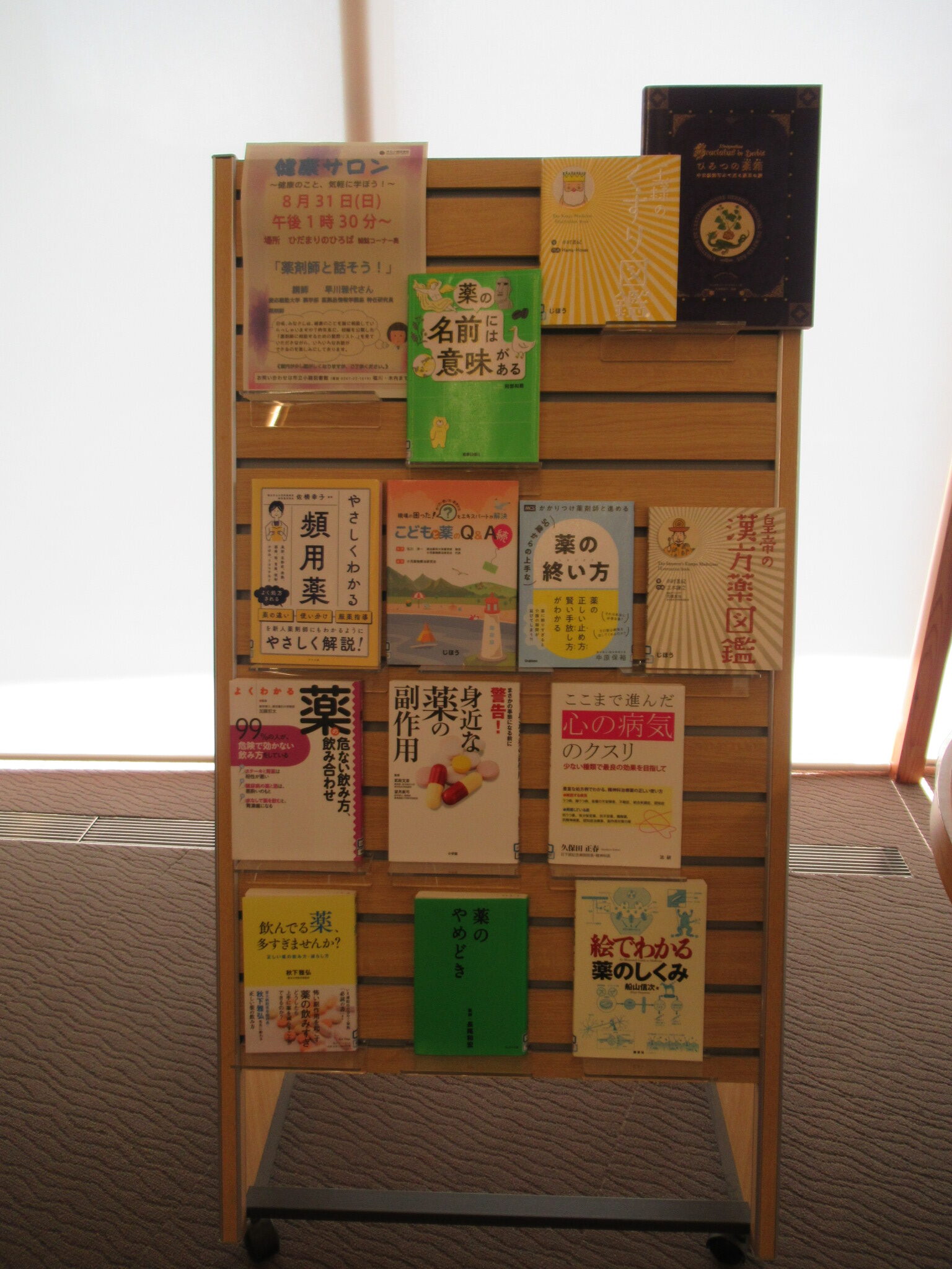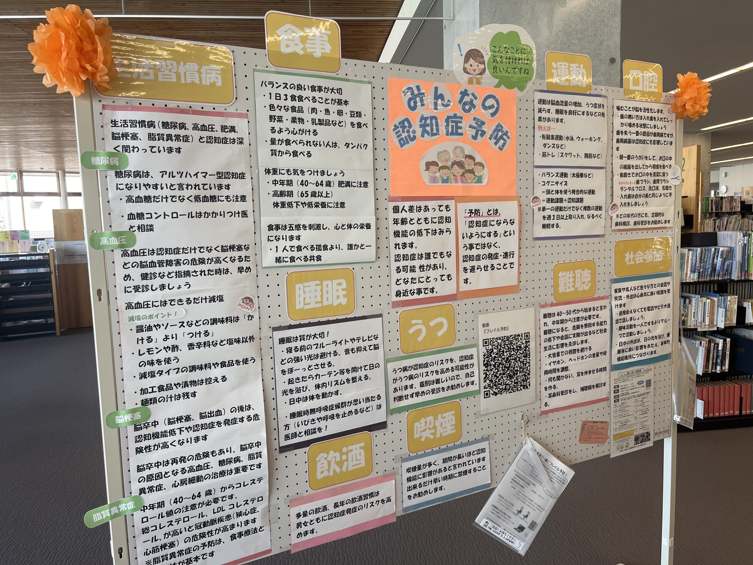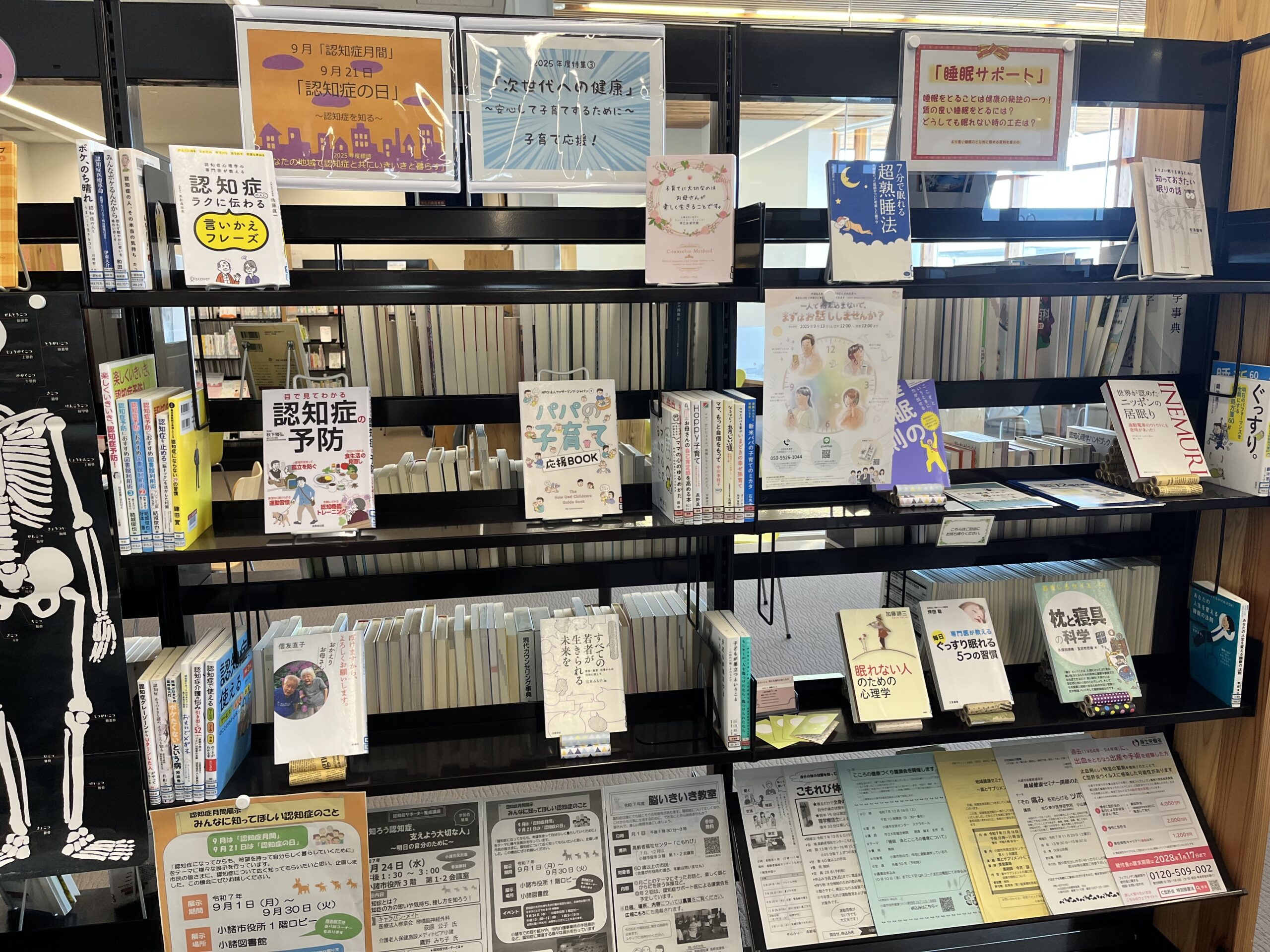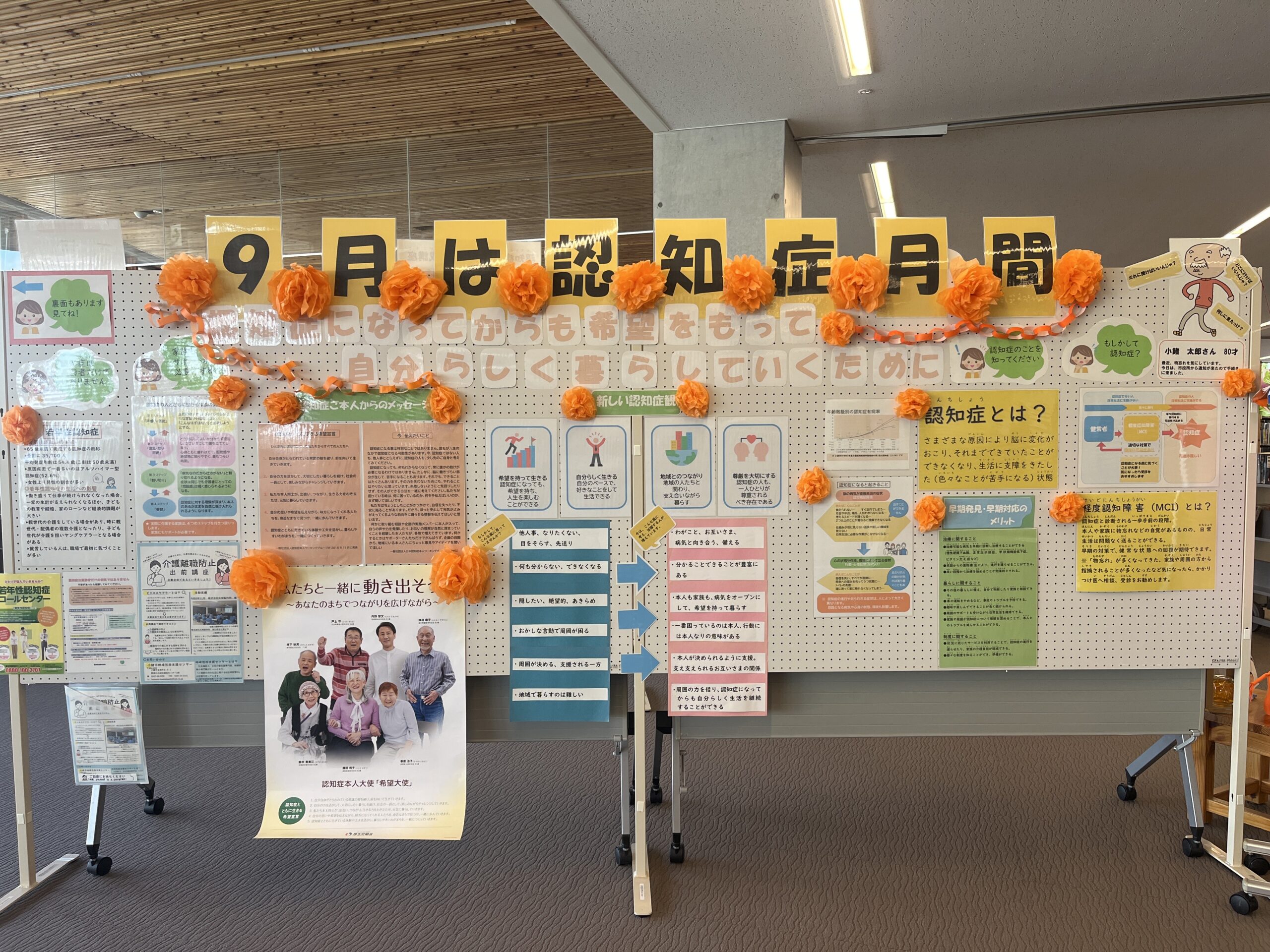 9月21日は認知症の日、9月は認知症月間です。認知症予防、認知症の人の介護、認知症とはといった認知症に関する資料を展示しています。館内ひだまりのひろばでは、高齢福祉課による認知症月間の展示も開催中です。