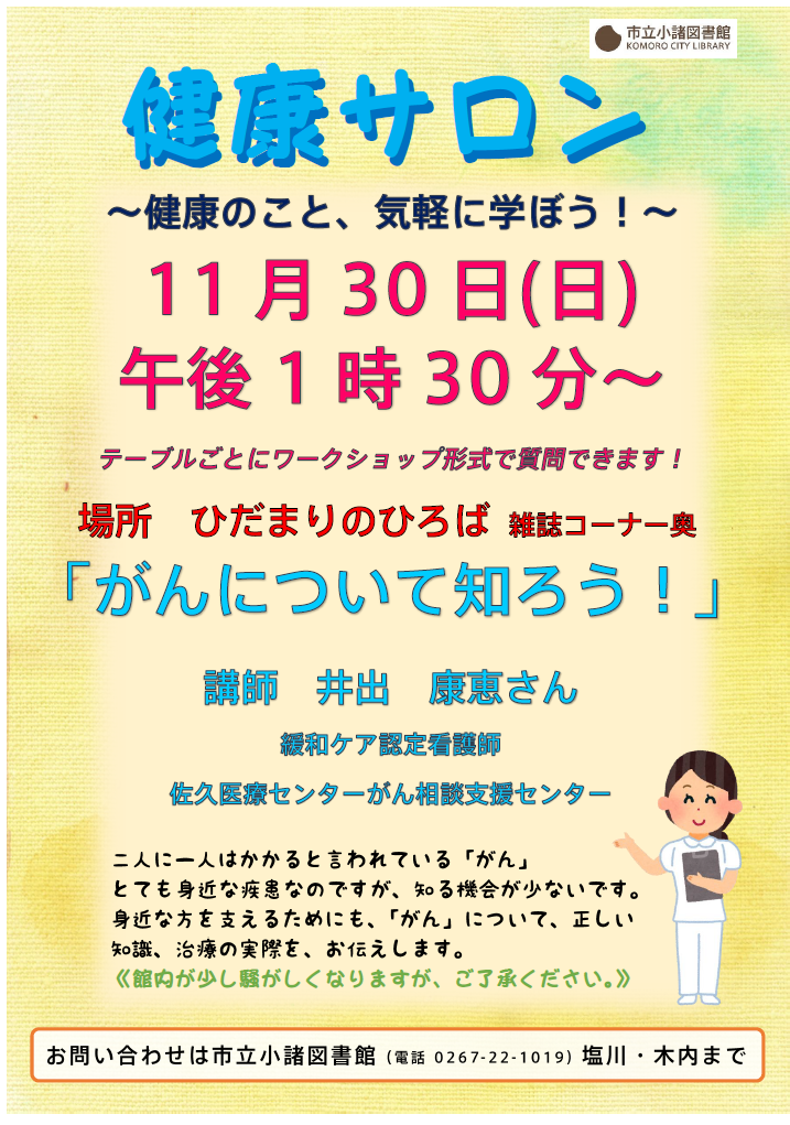 図書館で本を通して、身に着けることのできる知識に加え、直接、医療関連の専門の方からお話を聞くこと、また、実際に質問することで、交流を図り、より深い学びの場となればと思います。