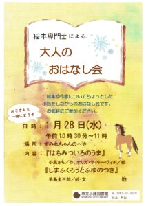年の初めの会は、書道家の乾千絵さんの力強い書と、書に合わせた谷川俊太郎さんの言葉、写真家の川島敏生さんの写真が見事に組み合わされた絵本『月・人・石』から始めました。語りは、北安曇地方に伝わる、雪がちらちら降るころの昔話「牛方とやまんば」をお話ししました。最後は、昨年11月に亡くなられた松居直さんの絵本から『だいくとおにろく』を読ませていただきました。