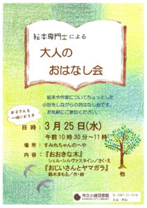 ようやく春らしい陽気になってきたこの季節にぴったりの絵本『だって春だもん』から始めました。続いて、大河ドラマ「光る君へ」にも登場する清少納言の「枕草子」より「春はあけぼの」が「声にだすことばえほん」として絵本で出版されているので、そちらを読んだ後、巻末の口語訳文と、橋本治/著の『桃尻語訳 枕草子』を紹介しました。お話は『あるだんなさんとおかみさんのはなし』。ものの置き場所をしょっちゅう変えたいおかみさんと、そのせいで探しているものをみつけられない旦那さんの話しを楽しく聴いていただきました。